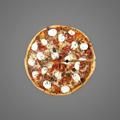 Tomato base, mozzarella, bocconcini, roasted capsicum, olives, salami, and chilli-flakes