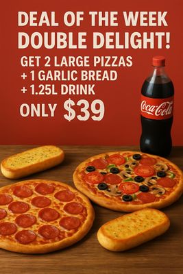Get 2 Large Pizzas + 1 Garlic Bread + 1.25L Drink for just $39!