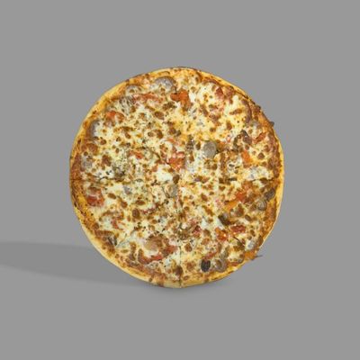 Tomato base, mozzarella, shaved ham, bacon, salami, beef sausage, and herbs