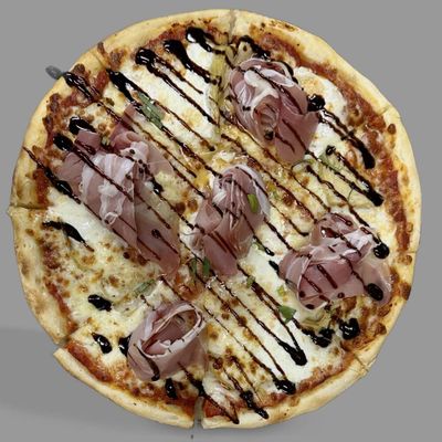 Tomato base, prosciutto, bocconcini, roasted potato, balsamic glaze, and diced tomato