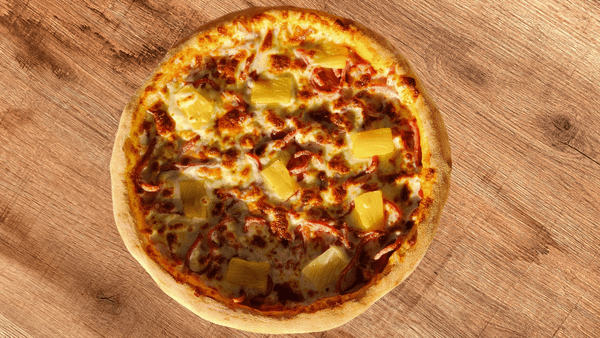 Tomato base, mozzarella, shredded ham, pineapple, and herbs