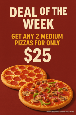 Get any Medium Pizzas for just $25. Cannot be combined with any other offers.