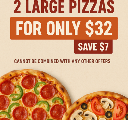 Get 2 Large Pizzas for just $32 – save $7! 😋