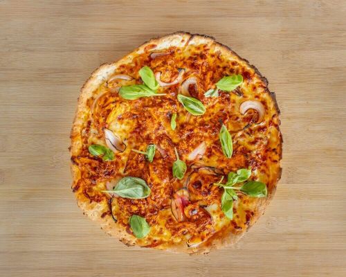 Tomato base, mozzarella, special tandoori marinated chicken, and onion