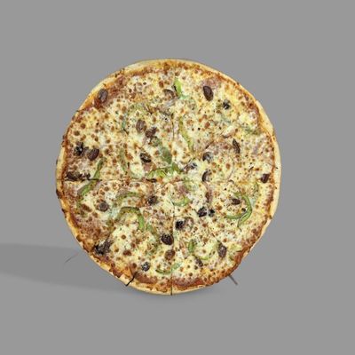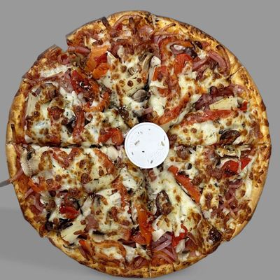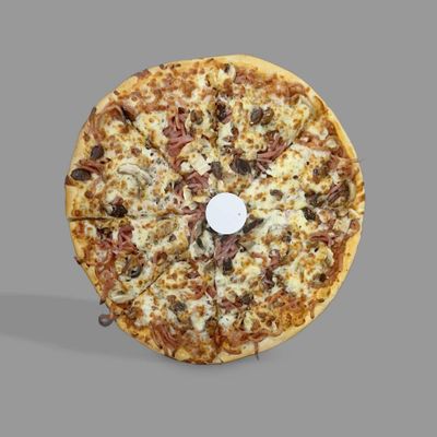 Tomato base, mozzarella, shaved ham, bacon, salami, mushroom, roasted capsicum, pineapple and olives, and herbs