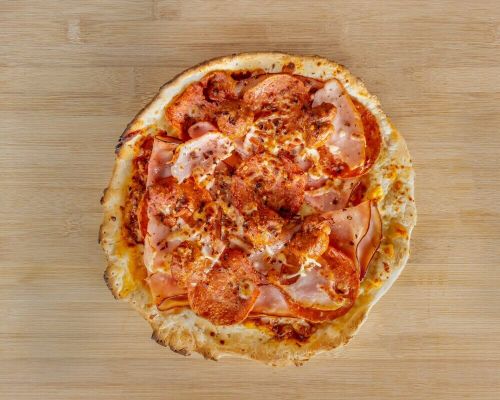 Tomato base, mozzarella, salami, roasted capsicum, olives, onion, and chilli-flakes