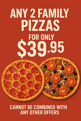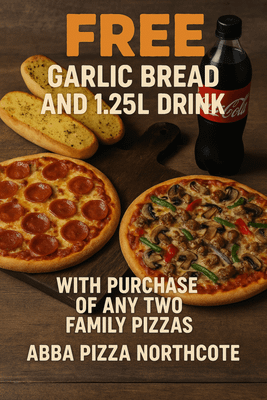 🔥 Hungry? Grab any 2 Family Pizzas for just $39.95 at Abba Pizza Northcote! 🍕 Not valid with other offers.