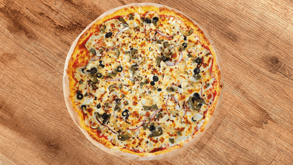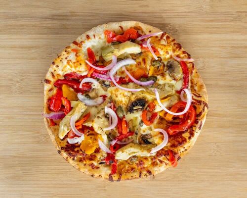 Tomato base, vegan cheese, roasted potato, artichoke, mushroom, jalapeños, caramelised onion, olives, capers, and chilli-flakes