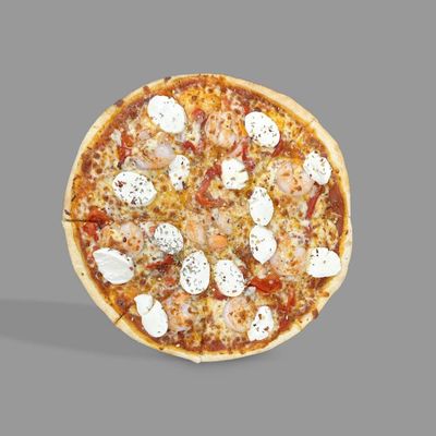 Garlic base, mozzarella, prawns, bocconcini, oregano, and chilli-flakes